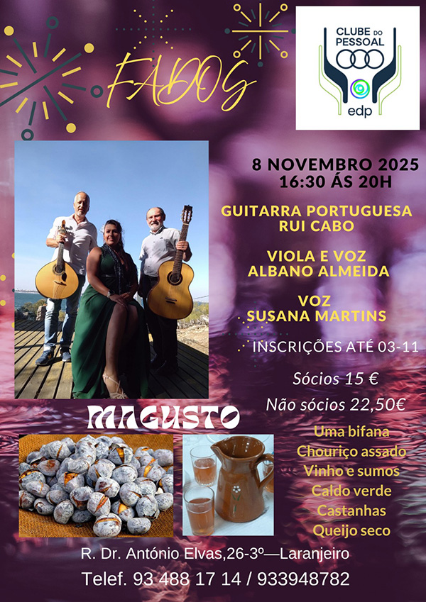 O Clube EDP Almada convida todos os associados e amigos a participarem numa tarde especial dedicada ao fado e ao convívio. No próximo dia 8 de novembro, entre as 16h30 e as 20h, o Clube será palco de um espetáculo com Rui Cabo na guitarra portuguesa, Albano Almeida na viola e voz, e Susana Martins na voz.